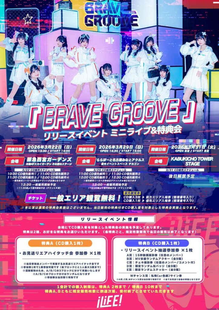 LIVE情報 2026年3月22日:『「BRAVE GROOVE」リリースイベント』@阪急西宮ガーデンズ|iLiFE!【あいらいふ】